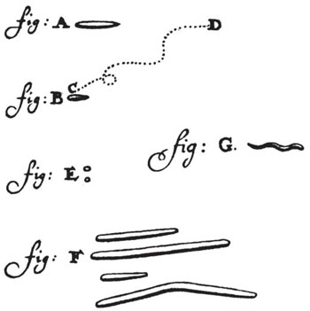 在进一步的实验中,列文虎克描述了“非常细小的微粒……(它们)弯曲移动,像鳗鱼在水中游泳的样子;(然而)鳗鱼总是朝前游,永远不会倒着游,但这些小生物却可以向前向后游动,不过游得很慢。”12动物学家克利福德·多贝尔(Cliff ord Dobell)评论道:“这是非常精明的观察,确凿地证明了列文虎克正在研究细菌……显然是细长而柔韧的丝状细菌(伪螺旋体)。”13