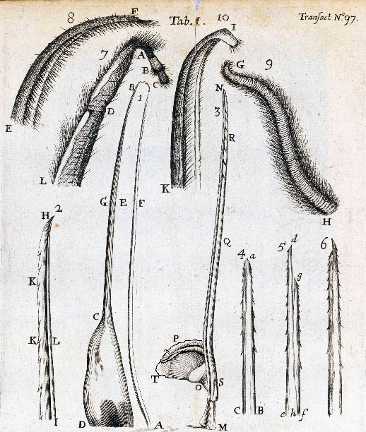 列文虎克在《自然科学会报》上发表关于蜜蜂螫刺(画面底行)及其鞘(画面顶行)的插图。