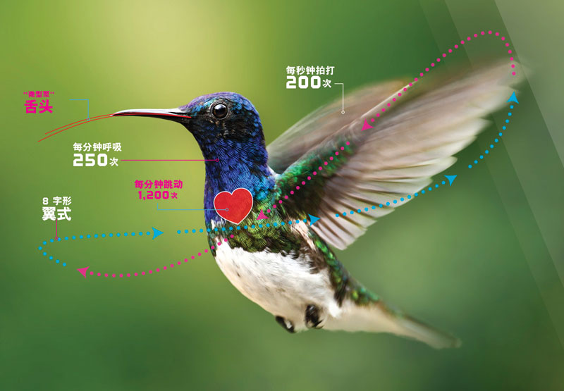 肩关节的灵活性就是一种独特的设计,这使得翅膀能扭到其他鸟类都扭不到的极端位置。不过,跟所有其他鸟类的翅膀结构都不一样的地方在于,蜂鸟的“肘”关节和“腕”关节都是固定的,这使其整个翅膀看起来更像一个坚硬的桨叶。3 控制翅膀快速扇动的胸肌显得相对巨大,它占了蜂鸟总重量的40%。在仿生工程方面,科学家已经进行了数百万美元的投资,都未能成功模仿这个精妙复杂的生物力学奇迹。然而,进化论者相信,随机突变、自然选择加上数百万年漫长时间的作用竟然领先于那些优秀的工程师。把蜂鸟出色的结构解释为一位神圣的杰出设计者之作品,似乎更有道理。