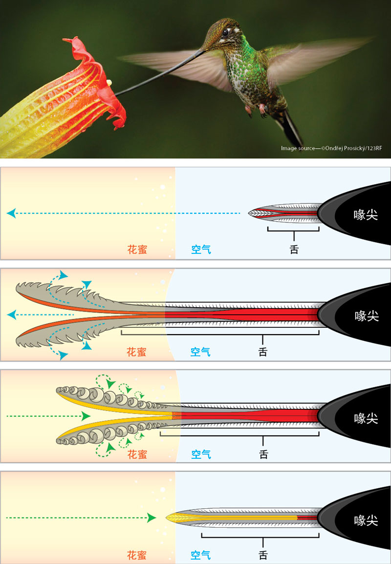 蜂鸟舌头的长度大约是其喙长的两倍,使它能够探入花朵深处。它由两条细长的管状结构构成,当接触液状花蜜的时候,它就会“像拉链那样被拉开”而变成两条分离的扁平状物。紧接着这扁平状物会收缩,把花蜜“抽”上来。此过程每天上演几千次,每次用时不到二十分之一秒,且交替迅速。你可以在纪录片《飞翔:鸟类的天赋》11中观看为这个令人惊叹的机制所制作的有趣动画片。