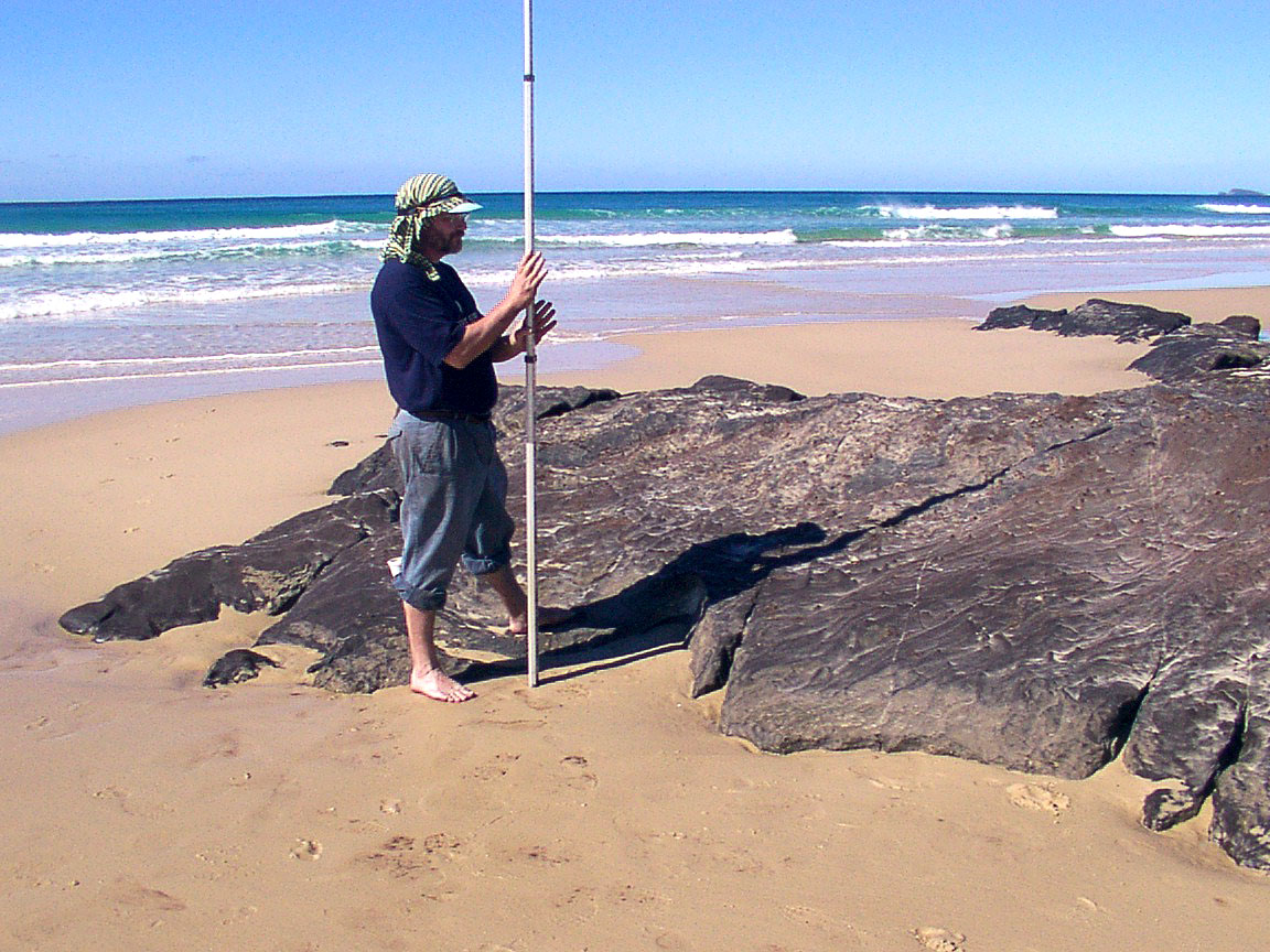 罗恩在弗雷泽岛东岸测量含腐植酸盐的砂岩(咖啡色岩石)