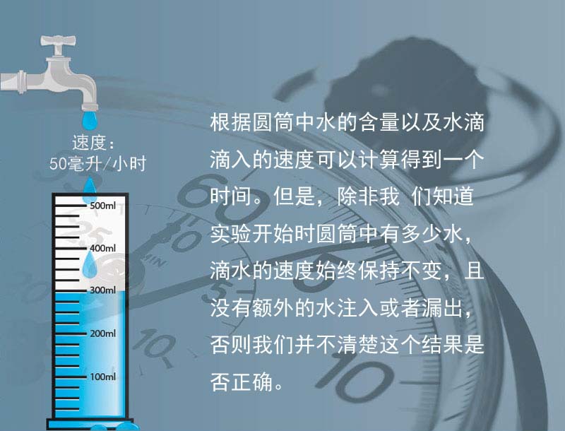 根据圣经记载,地球的年龄大约为6000年,但是主流的地质学家则认为地球的年龄为几十亿年。被问到这一问题时,罗恩解释,所有的定年法都是基于假设。他说没有人知道这些假设是否合理。认识这些假设的本质后,罗恩彻底破除了放射性定年法会挑战圣经纪年的观点。他用水滴入圆筒这样一个简单的例子来加以说明(上图所示)。罗恩指出他对圣经记载地球和宇宙的年龄为6000年,以及挪亚洪水距今4500年没有异议。