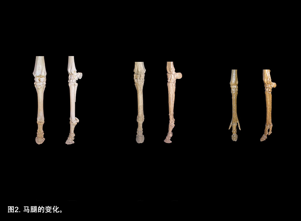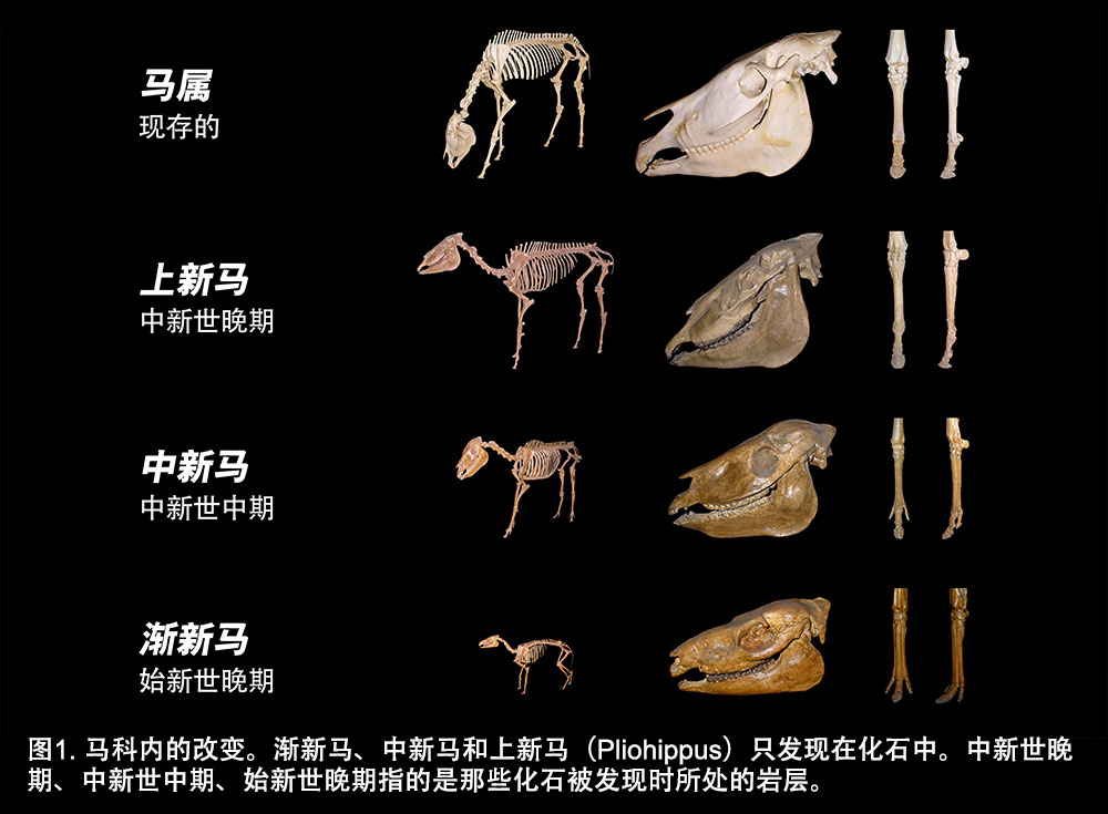 化石中有一个例子,它能表明同一物种有大量的同类,甚至变化出新物种,这个例子就是马的化石,请看这里的图1和2。灭绝的上新马(Merychippus)和中新马(Merychippus)与现存的马(马属)有很多相似之处,人们认为它们两个在同一个科。它们显然是马,但个头比现代的马要小一大截,腿和脚也不一样。1 比如上新马有三个趾,因此能更好适应潮湿的沼泽地,而单蹄更适合较硬的地面。就像达尔文在加拉帕戈斯群岛上观察的雀鸟一样,2 马在过去的几千年间也发生过变化,我们所知的现代马可能和上新马中新马有同样的祖先(如神创造的一类马会产生出几个马种,但所有马仍是同一类马)。