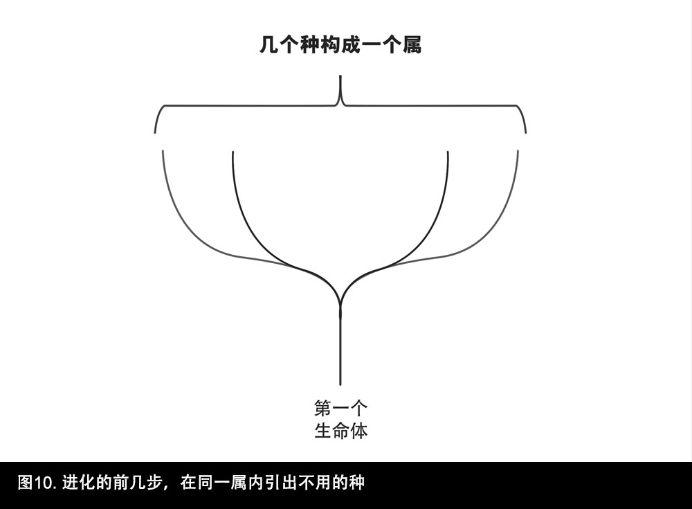 据说这些新物种后来会继续多样化到这样的程度—— 它们能被分成不同的属(也就是不同组的种—— 图11)。它们虽然有不同,但仍被认为是同一个科。之后随着进化的继续,它们会进一步分化,直到它们被分为不同的科(也就是不同组的属),接着是不同的目(也就是不同组的科),然后是不同的纲(也就是不同组的目)。最后进化会导致生物结构产生根本改变,以至这些生物就被分成了不同的门(也就是不同组的纲)。