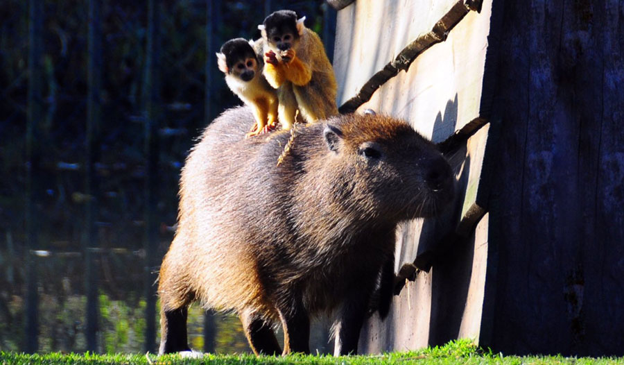 像这样互利的喂食关系在鸟类和哺乳动物之间并不希奇。10 但无论是在野外还是在圈养环境中,很多动物和水豚也如此亲近,我们不是很清楚这是为什么。例如,在动物园共养区,蜘蛛猴会骑在水豚的背上为它梳理毛发。这些动物通常生活在丛林里,和水豚并不生活在同一个自然栖息地。我们在网上搜索也会看到很多其他动物,比如猫、猴子,或鸭子也像蜘蛛猴一样伏在水豚的背上。