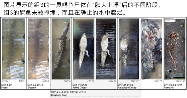 组2和组3的鳄鱼都在3-5 天内膨胀并上浮,平均漂浮32 天。这说明了动物死后要多快掩埋才能较好地保存下来。