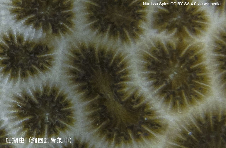 然而,哪怕最大的珊瑚也不像它看起来那么大。这种动物本身体型很小,只由几层细胞构成。下层细胞在其下面制造碳酸钙(CaCO3)“骨架”。骨架会逐渐变厚,但珊瑚虫本身却不变。骨架逐渐变厚的同时往往也会变宽,所以一个珊瑚集群可能会扩张至好几平米的区域,但厚度却仍只有几毫米。
