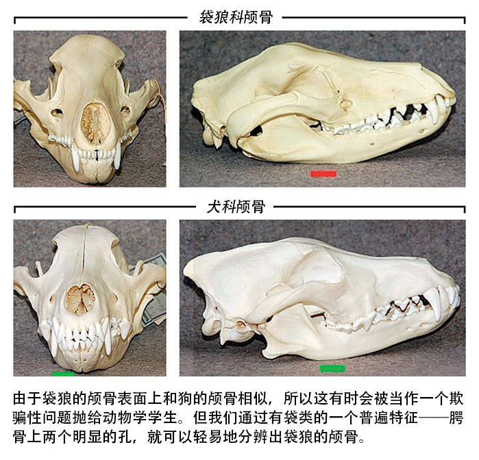 狗、狼、丁格犬是胎盘类哺乳动物,而有袋类动物(如袋鼠、考拉和负鼠)用袋囊7 来装幼崽。袋狼的学名是袋狼科(Thylacinuscynocephalus), 意即“ 头似狗的有袋动物。