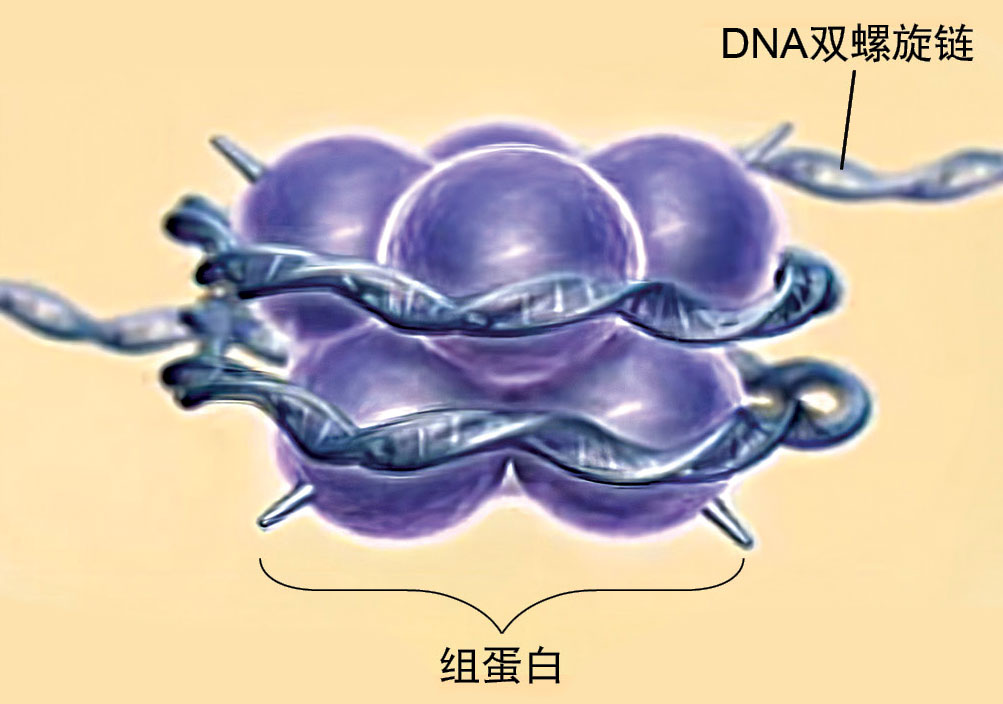 图2 在更复杂的生物(例如非细菌类的生物)中,DNA盘绕在称为组蛋白的蛋白质周围。通过控制盘绕过程,基因可以根据需要打开和关闭。DNA的某些片段包含一些信息,指定DNA与组蛋白结合的方式和位置,这也将控制基因被使用的时间和方式。因此,一个“基因”可能有某种蛋白质如何制造的信息,同时也有控制该蛋白质何时生产的信息。这就像一个句子有两层含义一样。