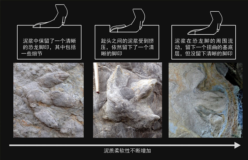 很多在最底层的砂岩层成形的脚印还留下了波纹的标记,却没有皮肤印记。所以恐龙脚底材料的稳定性直接影响留下的脚印细节。泥岩中的一些化石脚印显示了有些地方的泥太湿,留下的脚印轮廓不太清晰,还有泥浆挤入恐龙的脚趾缝。