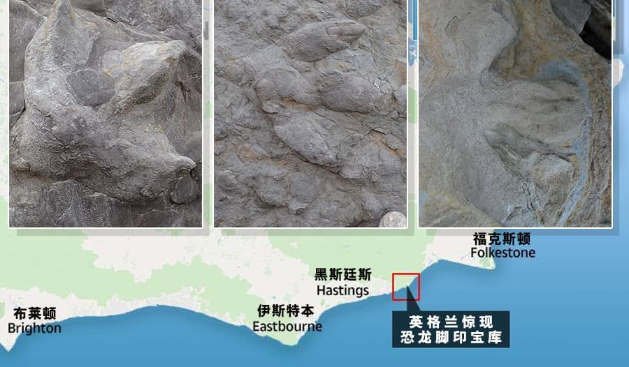 从 2014 年到 2018 年,海浪侵蚀所谓“白垩纪时代”(至今 1.45亿至 1 亿年)阿什当岩组(Ashdown Formation)导致悬崖崩塌,露出之前隐藏的部分,该研究组在此期间一共来了五次,考察这些因岩块脱落而露出的脚印。这些脚印形成于