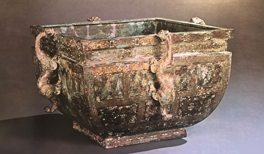 1975 年,在河南省三门峡的一个古墓中挖掘出的一件东周晚期(公元前三世纪)的酒器就很好地说明了这一点。2 这是用青铜铸造的,大部分的黄金镶嵌得以保存, 艺术造诣令人惊叹。酒器的四面各有一只动物,明显带有恐龙的外观特征,能轻易辨识出是蜥脚类恐龙。由于细长的脖子末端的头特别圆, 顶着酒器的缘,这个形象很可能代表圆顶龙(Camarasaurus)。其四腿伸向身体下方,腿部肌肉厚实发达,尾巴翘起,悬在空中,与酒器各面没有接触。