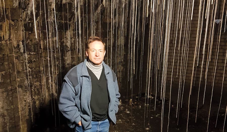 在这个历史悠久酒馆的地窖,通过一扇旧木门之后是酒馆的地窖。在地窖里面是一个令人惊叹的钟乳石奇观,有数百根非常细长的、像吸管那么细的钟乳石,几乎从天花板一直生长到地上,它们在昏暗的地窖中闪闪发光。此外,在地窖的地板还向上生长出粗短的石笋——所有这些矿物结构似乎都在挑战“数百万年”的教条。