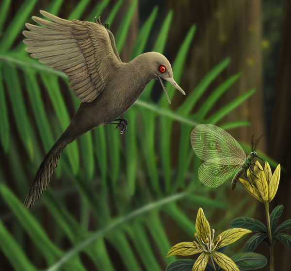 上图:研究人员根据头骨的CT扫描和想象所复原的宽娅眼齿鸟的样子。上方图:虽然在琥珀中只找到这种动物的头部(见图5),他们还是参考蜂鸟的姿态复原了宽娅眼齿鸟的整个身体。这两张想象的图其实都不能支持“和蜂鸟一样大小的恐龙”这个观点。
