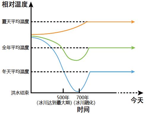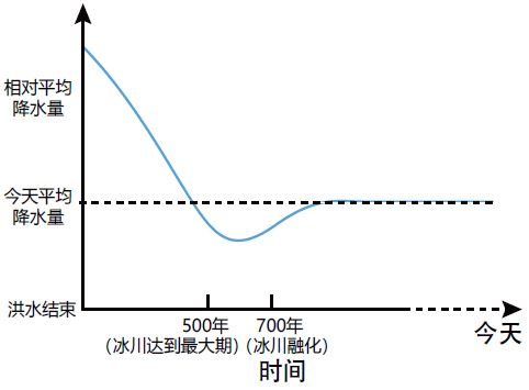 图4. 北半球中高纬度大陆的冬季、夏季和全年平均气温随时间(从大洪水结束,经过冰河期到今天)变化的估计曲线图(由Melanie Richard绘制)。 | 图5. 北半球中高纬度地区从大洪水结束,经过冰河期至今的年降水量估计曲线图(由Melanie Richard绘制)。 |