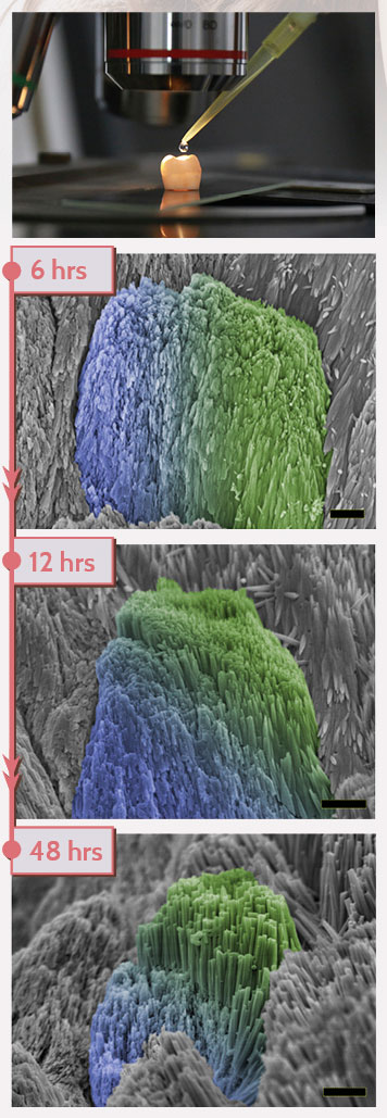 因此,科学家希望能通过研究仿制出牙釉质。但即使经过多年的努力研究,也没有人能在实验室中令人满意地仿制出天然牙釉质复杂的层次结构。然而,现在一个由中国浙江大学的仿生学家刘兆明领导的研究团队声称已经在这方面取得了突破。1,4 他们通过一种巧妙的方法,在志愿者的牙齿涂上含有磷酸钙离子簇的凝胶,并成功地在48小时内产生了一层薄薄的牙釉质(厚度为 2.7 微米,如图所示)。当然,为了与天然的牙釉质的厚度匹配,并能修补蛀牙,研究人员还必须在厚度方面改进数百倍。他们正在为此努力,并希望在两年内不需要使用填充的物料就能进行“牙釉质再生”的临床试验。3