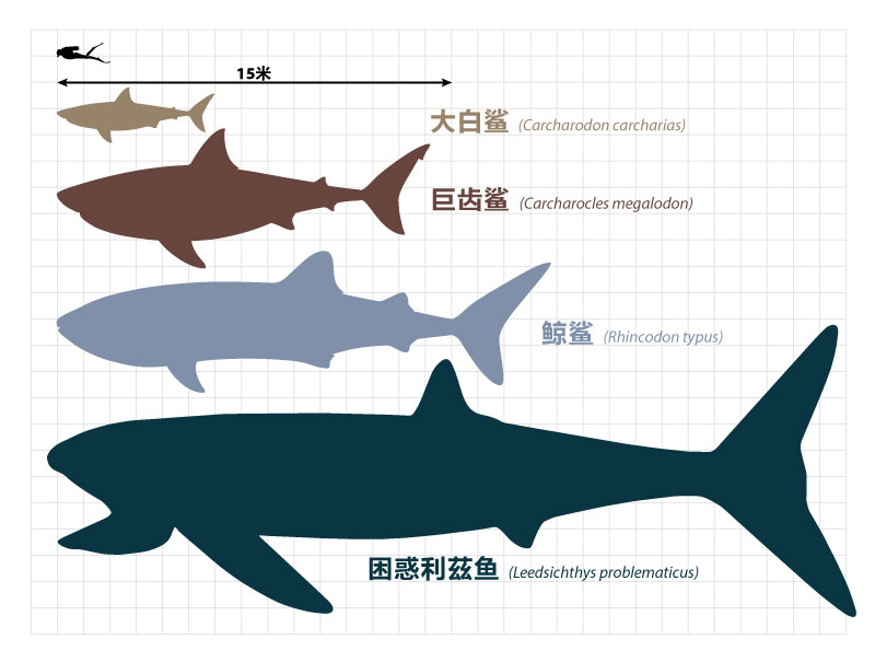 可能读者比较熟悉另一种已经灭绝的食肉巨鲨,称为巨齿鲨。研究人员估计这种巨大的鲨鱼长达 17米,是大白鲨长度的约 2 ~ 3 倍,是大白鲨重量的20 倍。鲨鱼的化石,包括鲸鲨和已灭绝的物种,能保存下来并被发现的只有牙齿。与它们的牙齿相比,它们全身其它骨头都是软骨,不易形成化石。2
