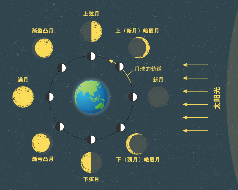 我们看到的月亮呈现有规律的变化,这些不同的月亮形状被称为月相。当月球绕着地球运转时,我们可以看到被太阳照亮的不同部分。如果地球大约处于太阳和月球之间,我们就可以看到整个月球被照亮的那一面,就称为“满月”。当月球运行至接近地球和太阳之间时,我们看到的大部分是未被照亮的那一面,因此就看到一个细长的月牙,我们称之为“新月”。当月球运行到介于新月和满月的中间时,月亮看起来近乎一个半圆形。