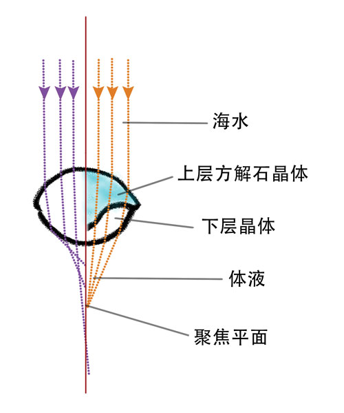 图4. 光线在三叶虫的双层晶片中发生折射和聚焦的示意图(理查德,参考文献8,第109页)