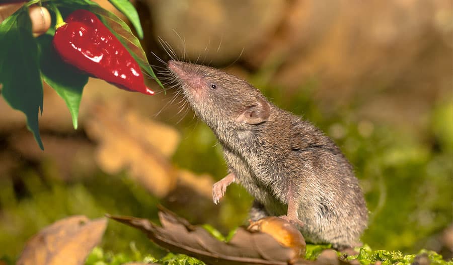 中国科研人员意外地发现,树鼩(Tupaia belangeri chinensis) 吃辣椒吃得很欢。3 他们发现树鼩基因中负责TRPV1 片段的单个位点突变后,树鼩对辣椒素的感受能力降低了。4这种化学物质对它们也就不怎么起作用了。
